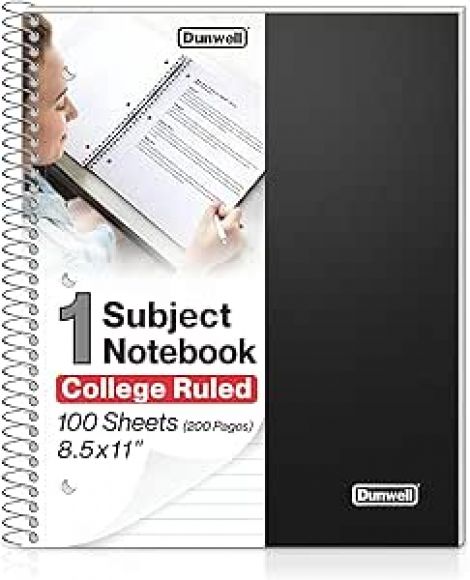 Dunwell College Ruled Spiral Notebook (Black), 1 Subject Notebook 8.5 x 11 for School, Plastic Cover, Pocket Divider, 100 Sheets (200 Pages), 3-Hole Punched Perforated 8 1/2 x 11 Paper