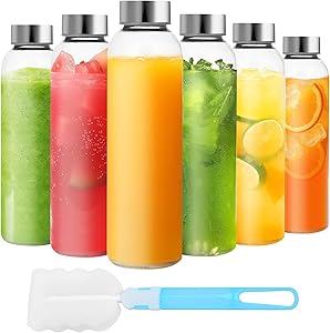Set of 6 Clear Glass Water Bottles with Lid 18oz for Juicing Reusable Bottle Glass Cup with Stainless Steel for Juicing, Refrigerator 100% Leak Proof Drinking Jar, BPA Free