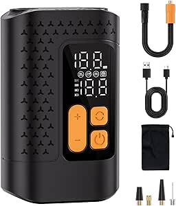 ▶【Compact And Powerful】 This bike pump features a easy-to-read dual digital LCD screen that displays more detailed values(maximum160 PSI). The electric bike pump equipped with a tire pressure monitoring feature and sets your desired PSI(3-160PSI), which makes it easy to monitor the condition of your tires pressure. no more worries of over-inflating also ensuring safe use.