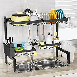 SNSLXH[2-Tier 4 Baskets]Over The Sink Dish Drying Rack, 24.8"-35.4", Large Sink Rack for Kitchen, Extensible and Adjustable, Saving Kitchen Space