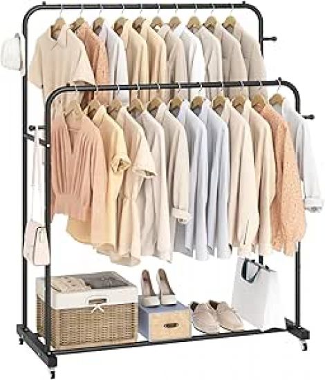 Laiensia Double Rods Garment Rack with Wheels, Clothing Rack for Hanging Clothes,4 Hooks, Multi-functional Bedroom Clothes Rack, Black