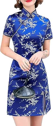 HFU Women's Cheongsam Costume Short Sleeve Side Slit Floral Print Mandarin Collar Evening Bodycon Cocktail Dress