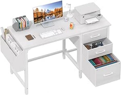 Lufeiya White Desk with Fabric File Drawers Cabinet, 47 Inch Reversible Computer Desk with Filing Cabinet for Bedroom Small Space Home Office, Modern Writing Table PC Desks, White