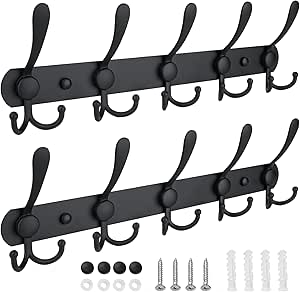 TICONN Wall Mounted Coat Rack, Five Heavy Duty Tri Hooks All Metal Construction for Jacket Coat Hat in Mudroom Entryway (Matte Black, 2-Pack)