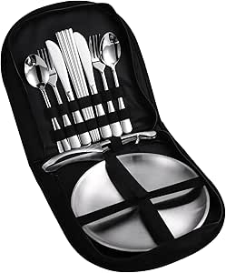 Complete Outdoor Dining Set for 2 People : Everything you need for a comfortable outdoor meal—includes 2 forks, 2 spoons, 2 knives, 2 stainless steel plates, all neatly stored in a compact zipper case.
