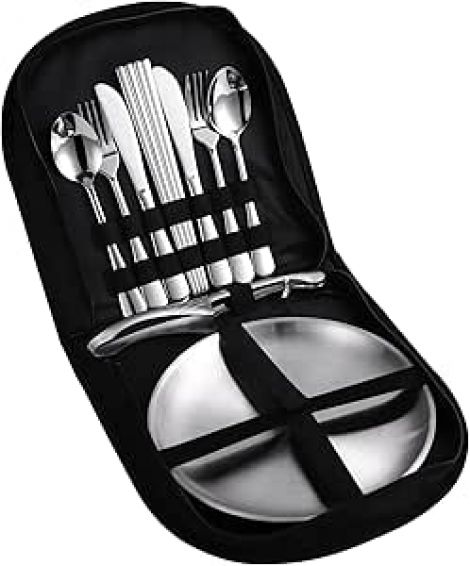 Stainless Steel Outdoor Camping Mess Kits - Includes Forks, Spoons, Knives, Chopsticks, Food Clip, Plates - Portable Cutlery Bag