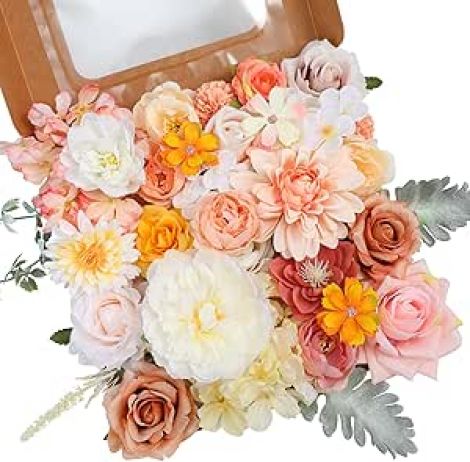 Artificial Flowers Combo, Mix Silk Flowers Roses, Peonies, Dahlias with Stems for DIY Wedding Bridal Bouquet, Baby Shower, Table Centerpieces, Home Decor, Floral Arrangements-Champagne Powder