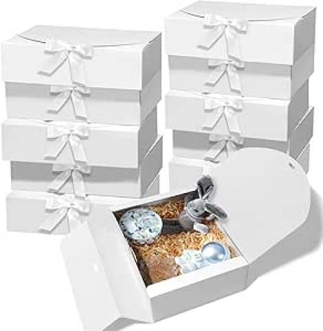 10 PCS Gift Boxes with Lids, 10.6x7.8x3.1 Inch Kraft Paper Gift Box, White with Ribbon, Bridesmaid Proposal Box for Wedding, Packaging, Present, Birthday, Cupcake