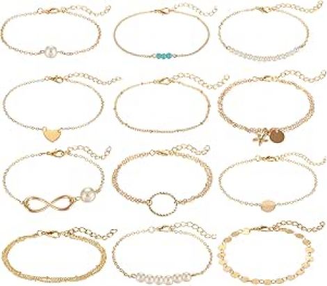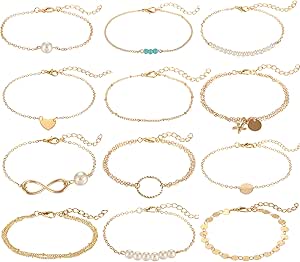 Softones 12pcs Simple Silver Gold Bracelets for Women Cute Pearl Bracelet Tiny Charm Dainty Handmade Bracelet Set Adjustable