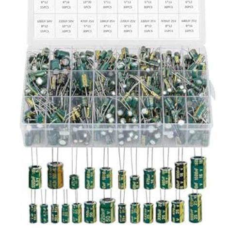 In this set, we offer 24 Value electrolytic capacitors include 6.3V 10V 16V 25V 50V, range from 1uF to 1500uF total 460pcs well packed in a plastic box, with clearly labeled compartments, parts inside will not slide or move around.