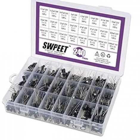 [ VARIOUS KINDS]: 240Pcs 24 different Kinds electrolytic capacitor, Including range 0.1uF-1000uF assortment kit. All capacitor come in a handy box with clearly labeled compartments, parts inside will not slide or move around.