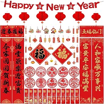 Easy to Decorate: Chinese New Year couplets are easy to use, you can use glue or tape to fix it. Chinese New Year window clings are easy to stick, wipe the window with a wet cloth, then put the paper cutouts cling decal on the glass, gently smoothing and you're done. The Chinese red envelopes are designed with a inserted closure, no need to use glue to stick it on, and Chinese red lanterns can be hung by simply unfolding them, very convenient.