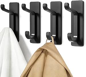 Wall Hooks for Coat and Towel: 13LB Adhesive Door Hanger Stick on, Black 4 Pack