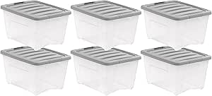 Amazon Basics Plastic Storage Containers with Secure Latching Lids, Stackable Organization Bins, 32 Quart, Set of 6, Clear/Grey