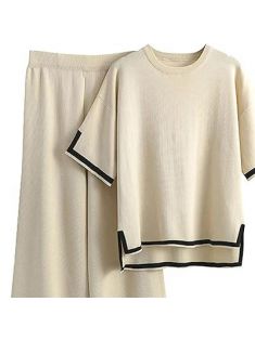 Tanming Sweater Sets Women 2 Piece Lounge Sets Short Sleeve Knit Pullover Tops Wide Leg Pants