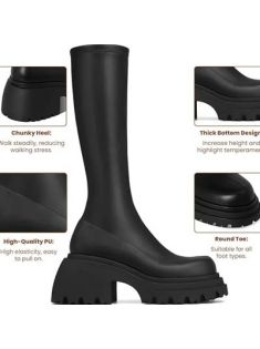 Kalstage Black Platform Boots Round Toe Chunky High Heels Pull-on Stretch Leather Boots Goth Punk Platform Boots Knee High Boots for Women