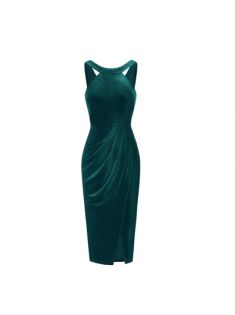 Women's Neck Sleeveless Pleated Tight Split Velvet Wrapped Party Cocktail Long Dress