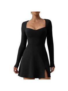 QINSEN Women's Sweettheart Neckline Long Sleeve Dress Side Slit Stretch Flare Mini Dress
