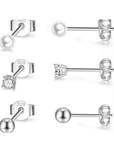 Sterling Silver Stud Earrings for Women Girls Men- 3 Pairs 3mm Tiny Ball Stud Earrings Round CZ Earrings Pearl Earrings Set Cartilage Small Tragus Earrings
