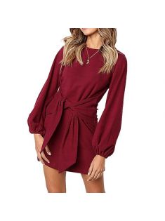 women's elegant short dress with lantern sleeves round neck and waist tie knitted cocktail party dress