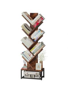 Tree Bookshelf Metal Base, 7 Tier Bookcase Storage, Floor Standing Bookshelf Organizer for CDs/Books, Bookshelves for Bedroom/Living Room/Home Office (Tree-Brown)