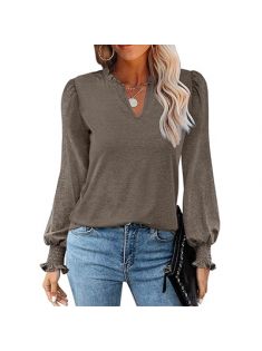 women's bubble long sleeve T-shirt autumn cute casual pleated V-neck tunic