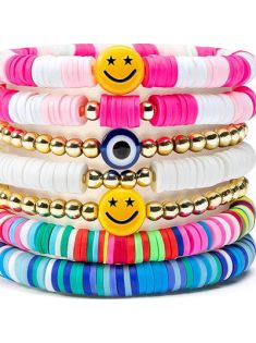 Y1tvei 7Pcs Heishi Surfer Bracelets Set Colorful Preppy Happy Smile Evil Eye Beaded Stretch Clay Stackable Boho Disc Y2K Kidcore Aesthetic Summer Beach Jewelry for Women Girls