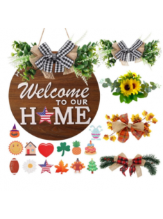 Interchangeable Welcome Sign for Front Door with 4 Seasonal Wreaths and 14 Changeable Icons, Farmhouse Porch Decor, Seasonal Rustic Wooden Sign home décor.