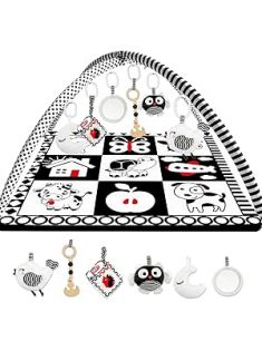 QUOKKA Padded Baby Gym Mat for Floor Tummy Time - Super Soft Black&White Play Gym Mat for Kids Toddlers & Infants - 6 Toys | Thick Pad | Machine Washable | Black White Colors for Vision Developmen