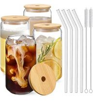 Drinking Glasses with Bamboo Lids and Glass Straw 4pcs Set - 16oz Glass Cups, Iced Coffee Glasses, Cute iced Tea Glasses, Beer Glasses, Ideal for Coffee Bar Accessories, Aesthetic Gift - 2 Brushes