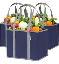 Reusable Grocery Bags (3 Pack) – Heavy Duty Reusable Shopping Bags with Box Shape to Stand Up, Stay Open, Fold Flat – Large Tote Bags are Foldable with Long Handles & Hard Bottom (Navy Blue)