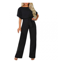Loose Short Sleeve Belted Wide Leg Pant Romper Jumpsuit Business Casual One Piece Outfits