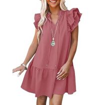 Dokotoo Womens 2024 Summer V-Neck Drawstring Ruffle Cap Short Sleeve Side Pockets Mini Dress Sundress