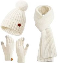Womens Long Scarf Gloves and Hat Set Cold Weather Hat Scarf Glove Set for Women Winter Beanie Hats with Pom Pom