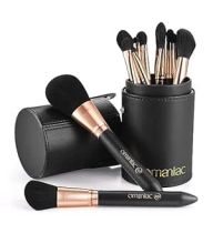 OMANIAC Makeup Brush Set Professional, 12 Pearlescent Wood Handle Makeup Brushes, Premium Cruelty-Free Synthetic Fiber Hair, Travel Make up Brushes Set with Case (Black).