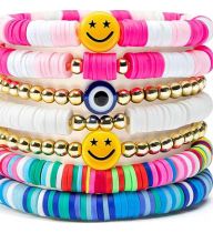 Y1tvei 7Pcs Heishi Surfer Bracelets Set Colorful Preppy Happy Smile Evil Eye Beaded Stretch Clay Stackable Boho Disc Y2K Kidcore Aesthetic Summer Beach Jewelry for Women Girls