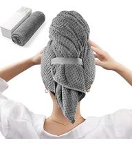 YFONG Large Microfiber Hair Towel Wrap for Women, Soft Hair Drying Towel with Elastic Band, Fast Drying Hair Turbans for Wet Curly Long Hair, Microfiber Towel for Hair Anti Frizz 26.3" X 40" (Gray)