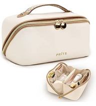 Prite Christmas Gifts Large Capacity Cosmetic Bag for Women Portable Waterproof PU Leather Makeup Bag Open Flat Makeup Organizer With Clear Divider and Handle(Beige)