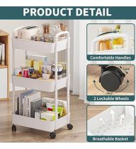 EZ COZY 3-Tier Rolling Cart, Plastic Rolling Utility Cart with Wheels, Lightweight Rolling Storage Cart Organizer, Easy Assemble Storage Trolley for Kitchen, Bathroom, Living Room, Office (White)