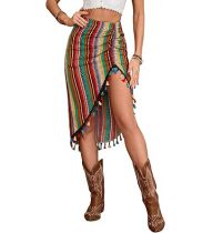 Women's Boho Tassel Trim Skirt Split Ruched Fringe Hem Midi Skirts Rave Country Concert Festival Outfits