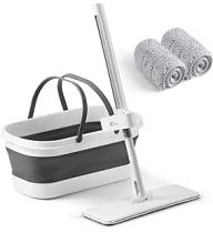 Oshang Flat Mop and Collapsible Bucket OG7 with Wheels, 2 Washable Reusable Microfiber Pads, Pure White