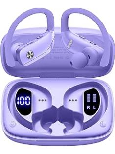 bmani Wireless Earbuds Bluetooth Headphones 48hrs Play Back Sport Earphones with LED Display Over-Ear Buds with Earhooks Built-in Mic Headset for Workout Purple