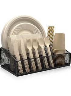 Paper Plate Organizer for Countertop - Metal Silverware Caddy with 6 Compartments for Paper Plate Cup Napkin Utensil Holder Caddy for Party Camping Picnic Black