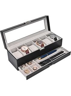 ProCase Watch Box for Men, 6 Slot Watch Display Case with Drawer, Mens Watch Case With Glass Lid, 2-Layer Jewelry and Watch Storage Watch Holder Organizer for Men Women -6 Slot, Black