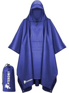 PTEROMY Hooded Rain Poncho for Adult with Pocket, Waterproof Lightweight Unisex Raincoat for Hiking Camping Emergency