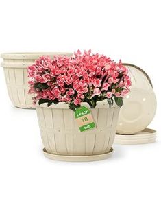 Quarut 10 inch Plastic Flower Pots for Indoor Plants,4 Pack Large Outdoor Planter Pot with Drainage Holes & Saucers,Imitation Wine Barrel Design,for Indoor Outdoor Garden Plants(White)