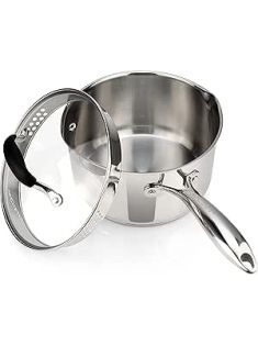 AVACRAFT Stainless Steel Saucepan with Glass Lid, Strainer Lid, Two Side Spouts for Easy Pour with Ergonomic Handle, Multipurpose Sauce Pan with Lid, Sauce Pot (Tri-Ply Capsule Bottom, 3.5 Quart)