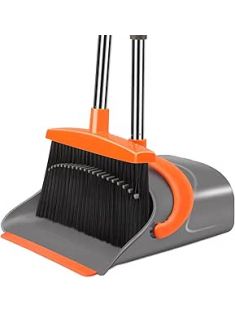 Broom and Dustpan Set for Home, Broom and Dustpan Combo for Office, Long Handle Broom with Upright Standing Dustpan,Indoor&Outdoor Sweeping (Gray&Orange)