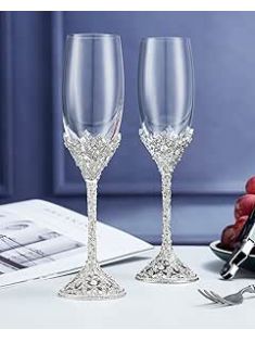 Champagne Flutes - Crystal Glass Metal Base With Crystal Stones, Set of 2 Toasting Flute Pair, Wedding Anniversary Party Birthday Banquets and Gifts for Bride and Groom7oz
