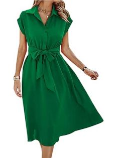 ECOWISH Womens Casual Midi Dresses Solid V Neck Short Sleeve Button Shirt Belted Dress with Pockets for Spring Summer 2024